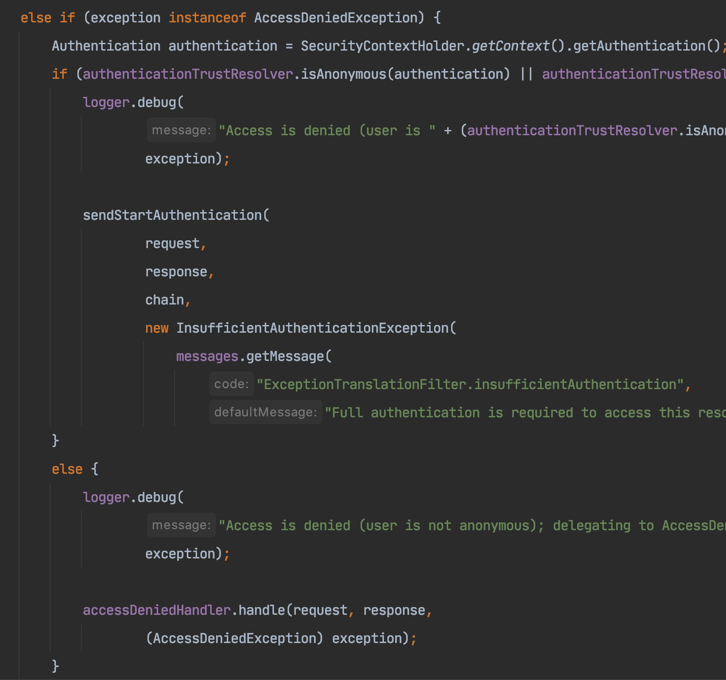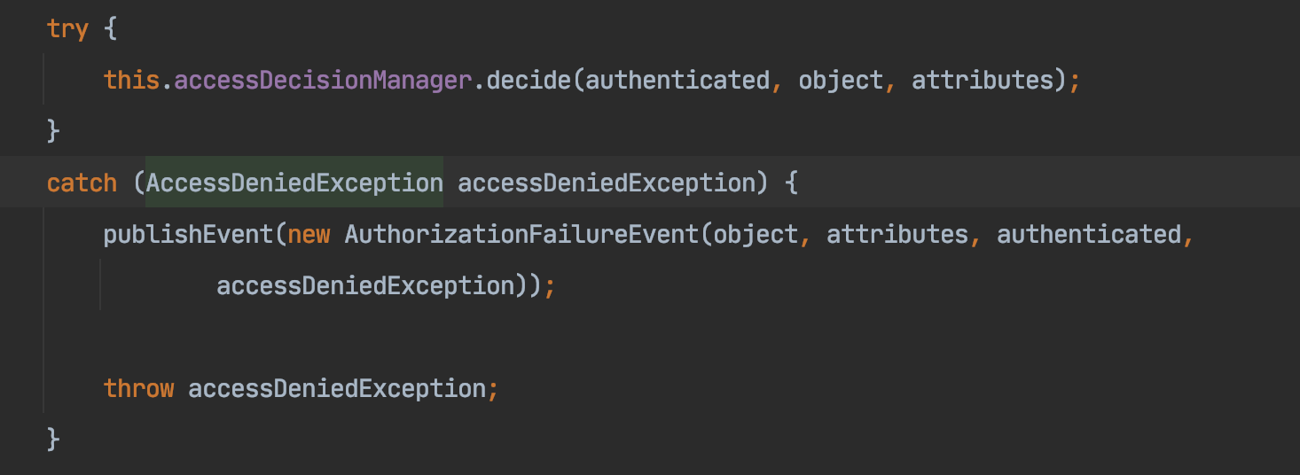 인가예외가 발생하게 되면 이필터가 AccessDeniedException에서 예외를 받아서 다시 예외를 throw 하게 되는데 이 예외를 어디서 받냐면