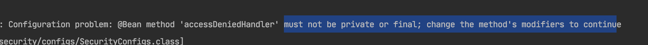 요놈이다 구현했던 CustomAccessDeniedHandler를 이용해서 에러페이지로 이동할수 있게 @Bean으로 설정 설정해줬지만 보면 private이다. public 으로 바꿔주자! 단순히 접근제한 때문인가? 라고 생각이 들어서 스프링 문서를 찾아봤다